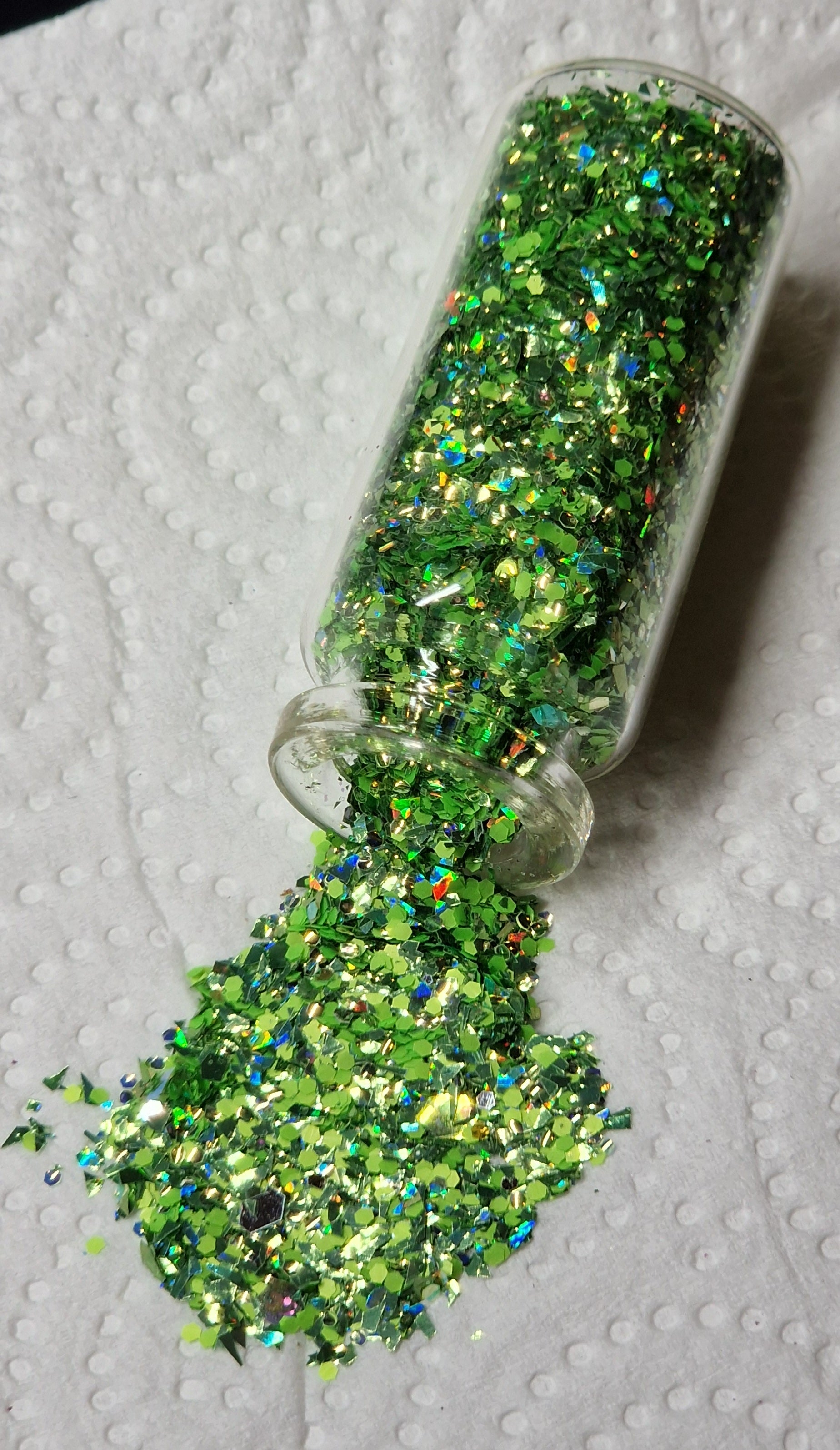 A hand picked mix of small, meduim and large round, and shards glitter. 5g supplied in 10ml corked bottles
